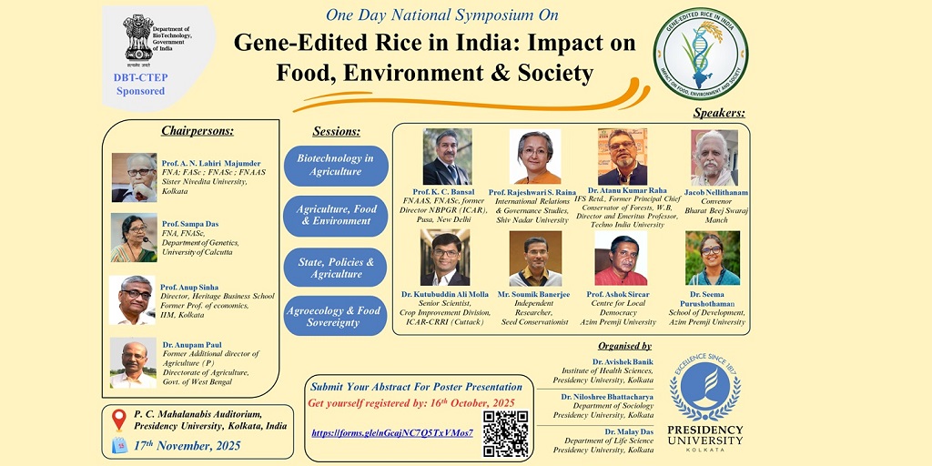 One Day National Symposium on “Gene-Edited Rice in India: Impact on Food, Environment and Society” at P. C. Mahalanabis Auditorium, Presidency University, Kolkata, on 17th. November 2025 Programme Schedule